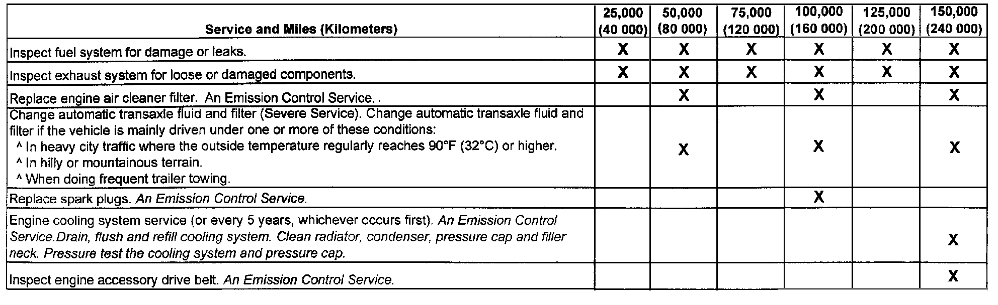 service (I or II) after the indicated miles (kilometers) shown for each item.
