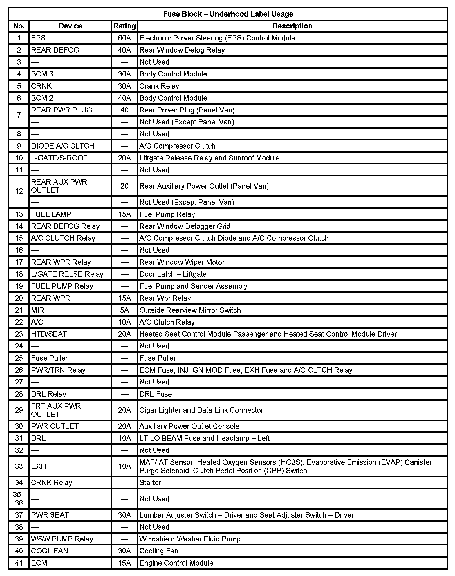 Fuse Block - Underhood Label Usage (Pin 1 To 41):