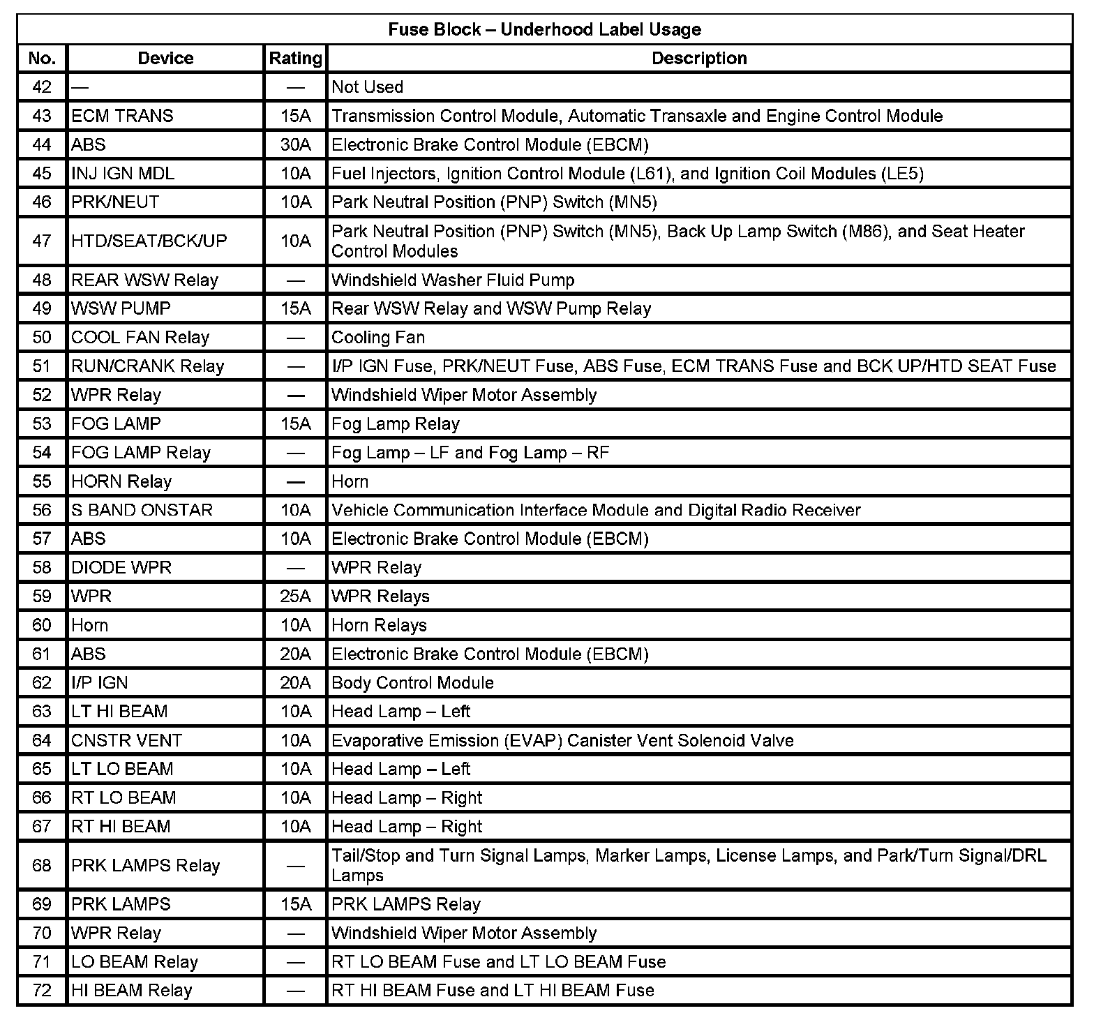 Fuse Block - Underhood Label Usage (Pin 42 To 72):