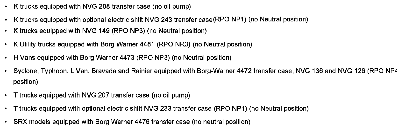Dinghy towing is permitted on the trucks shown with the transfer case placed in the Neutral position. Refer to the end of this bulletin for identification information to determine type of transfer case.