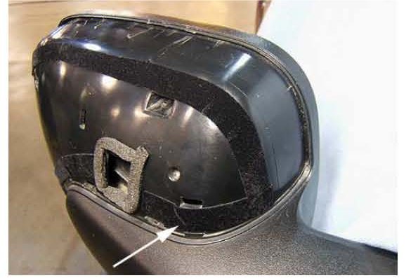 3. Install pieces of flocking tape starting at the shim stock, and wrapping around to the underside of the mirror housing. Ensure the tape is inboard of the retainer hole locations.