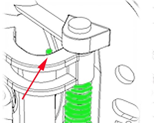 8. Restore tension to the spring by hooking the exposed end of the spring (1) under the spring land on the black housing (2).