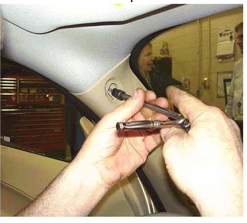 Install the energy absorbing (EA) plastic piece into the headliner at both the driver and passenger side A-pillar locations.
