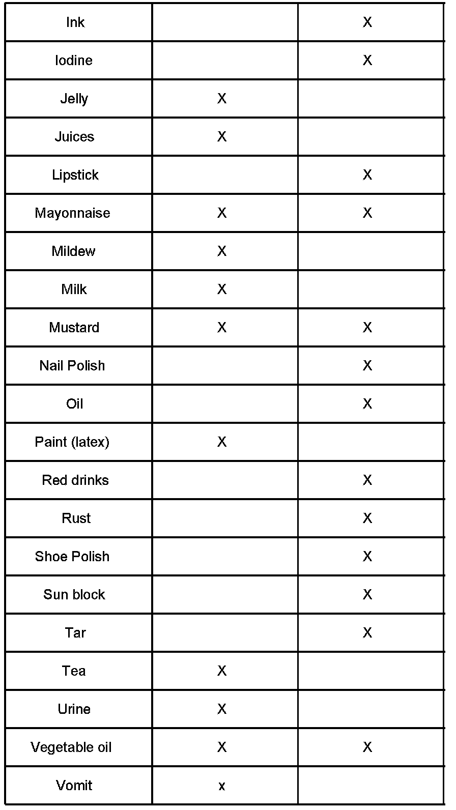 When cleaning upholstery and carpet stains ONLY, the cleaning chart shown will help you determine which cleaner/formula works best on a particular stain. The chart lists many of the common stains. Some complex stains may require the application of both stain removers, one after the other, to remove both food-based oils and synthetic oils.