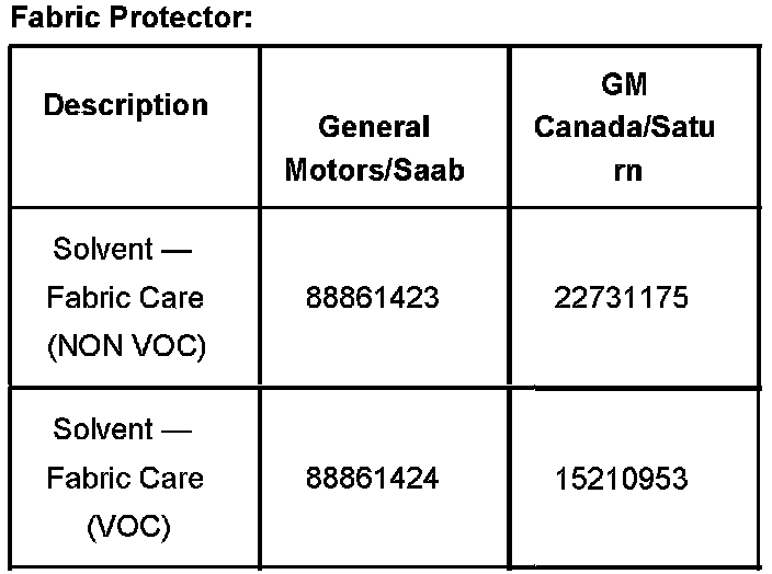 Fabric protector shown may not be available through General Motors dealerships at this time. The fabric protector can be obtained from a Saturn dealership until such time it is available through General Motors Parts Departments.