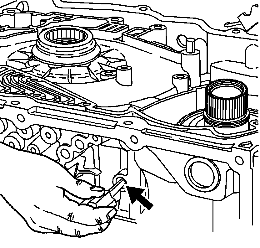 2. In order to verify the proper positioning of the band, insert a screwdriver through the Intermediate/Fourth servo bore. The screwdriver should press on the servo pin rest and compress the band around the reverse clutch housing.