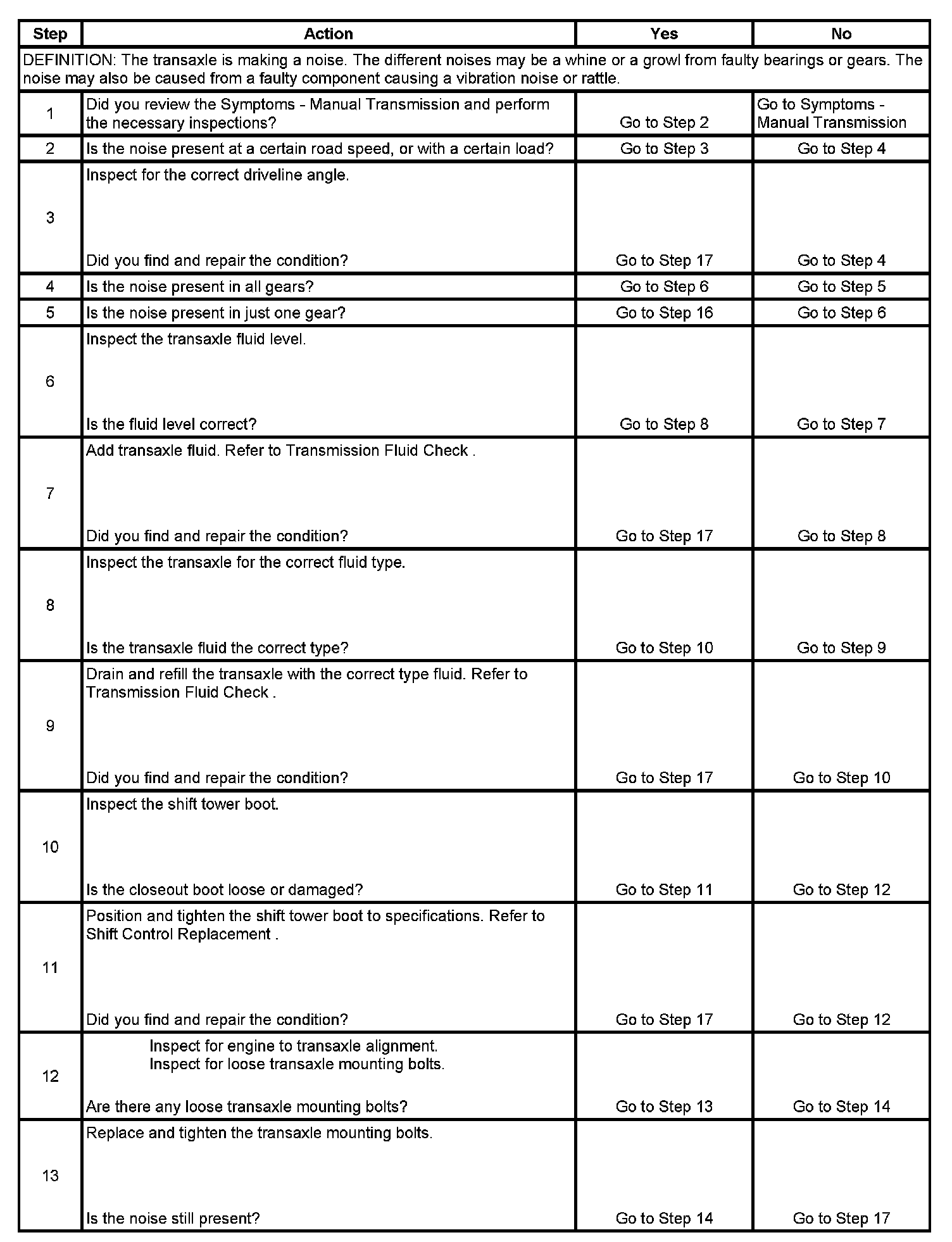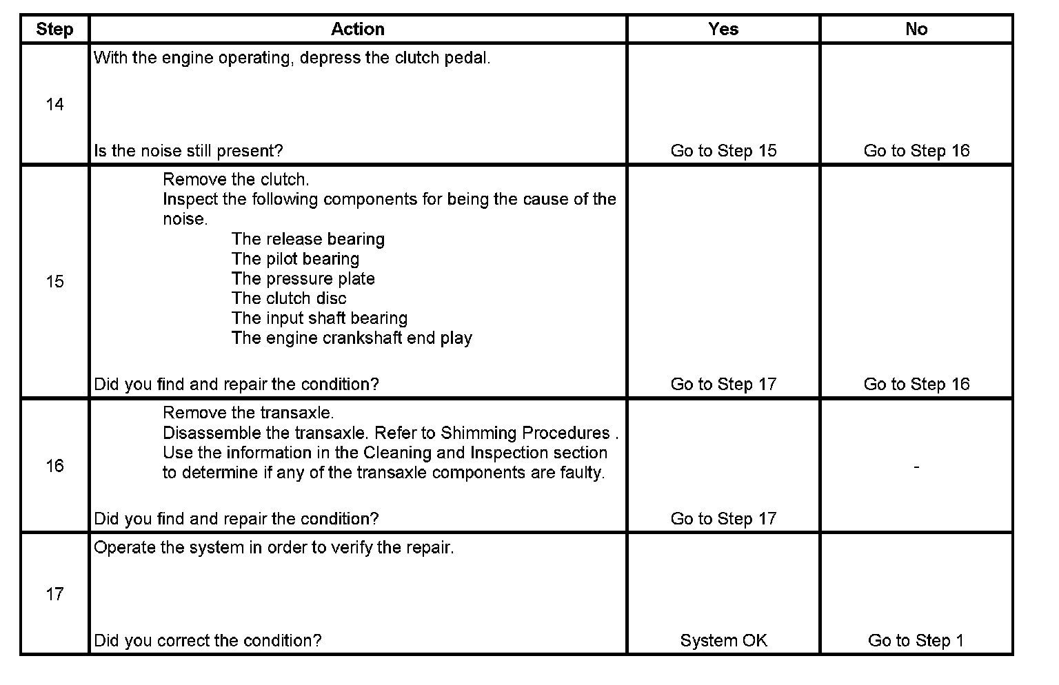 14. This step tests to determine if clutch components are making the noise. Depress the clutch pedal slowly and listen for the change in noise. If the noise changes while pressing the pedal, it may be a faulty clutch component. If the noise does not change until the clutch is completely disengaged, the transaxle component is faulty.