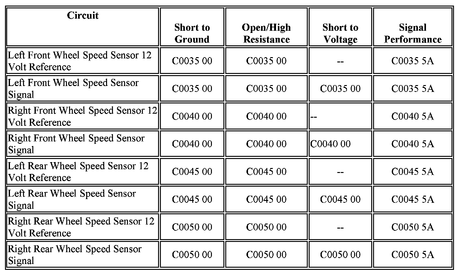 - DTC C0050 5A: Right Rear Wheel Speed Sensor Circuit Plausibility Failure.
