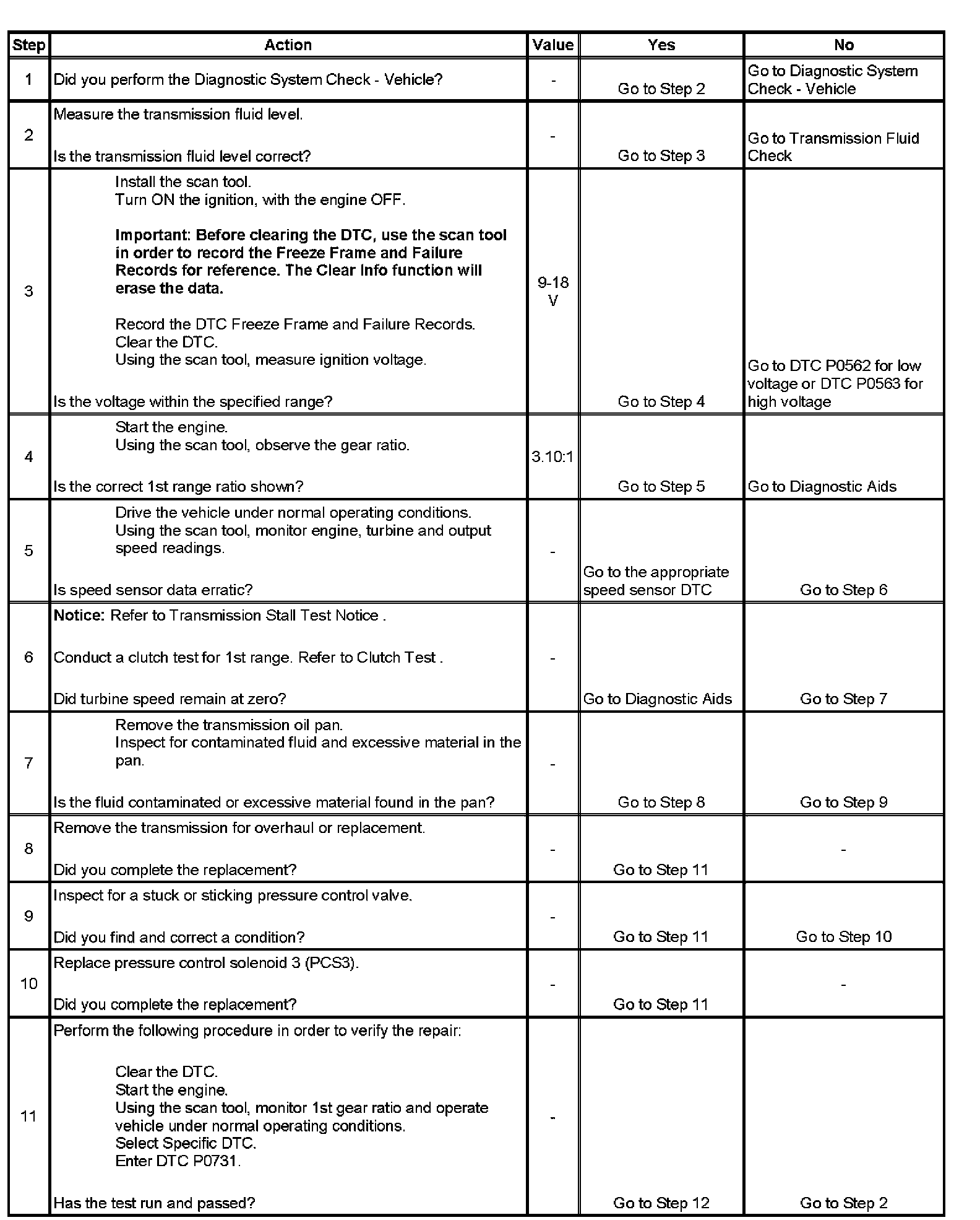 DTC P0731 sets when the calculated 1st range ratio, steady state, differs from the known 1st range ratio.