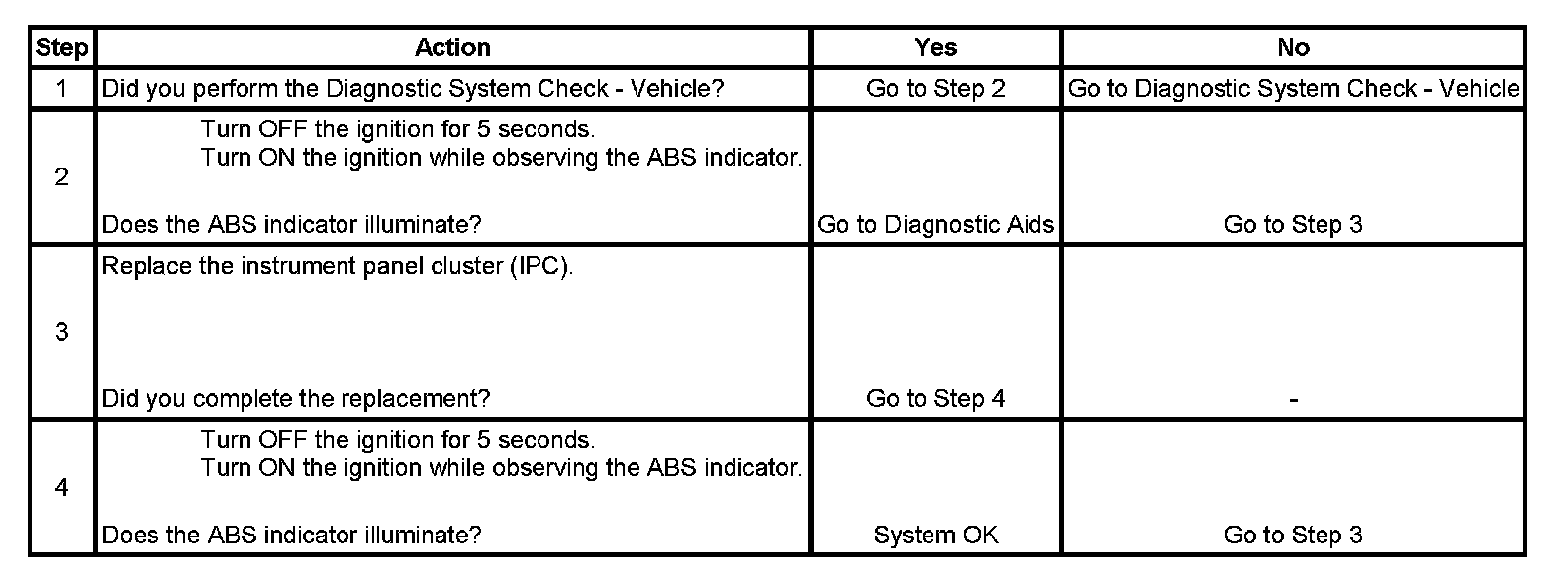 Replace the Instrument Panel Cluster if the ABS indicator intermittently fails to operate during the bulb check.