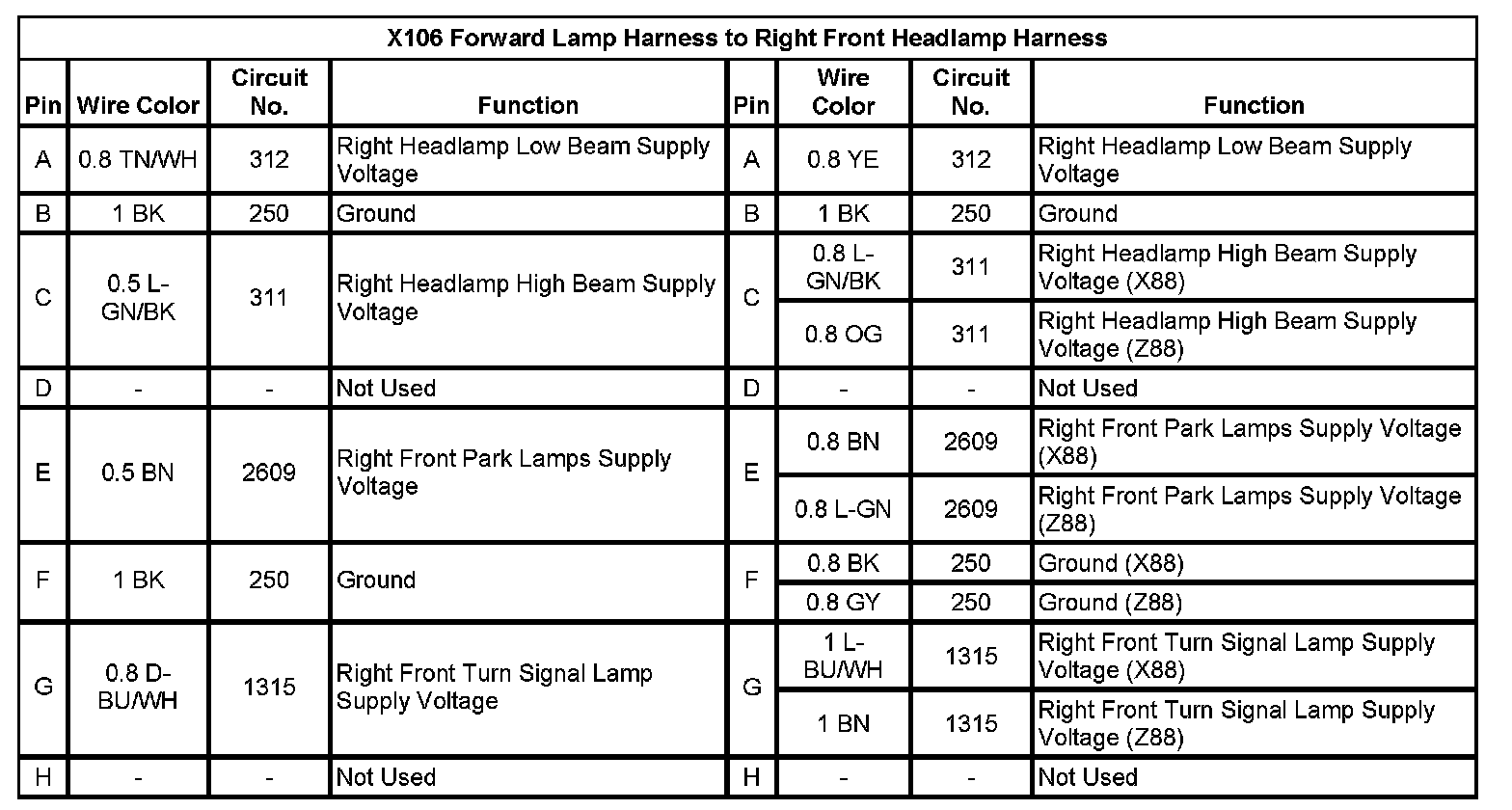 X106 Forward Lamp Harness to Right Front Headlamp Harness