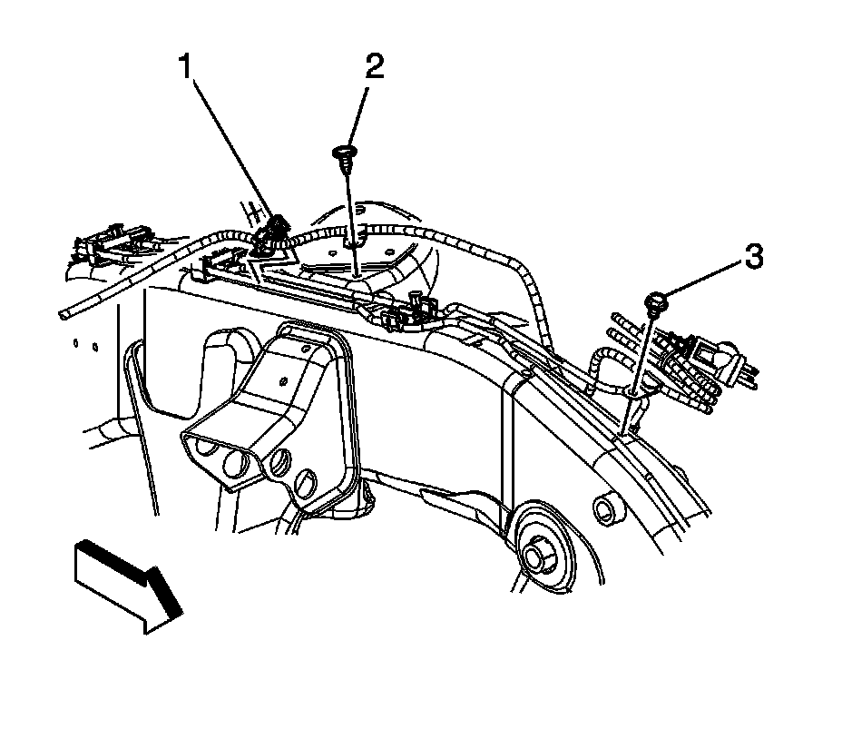 2. Position the coolant heater cord clip to the frame and install the coolant heater cord bolt (3).