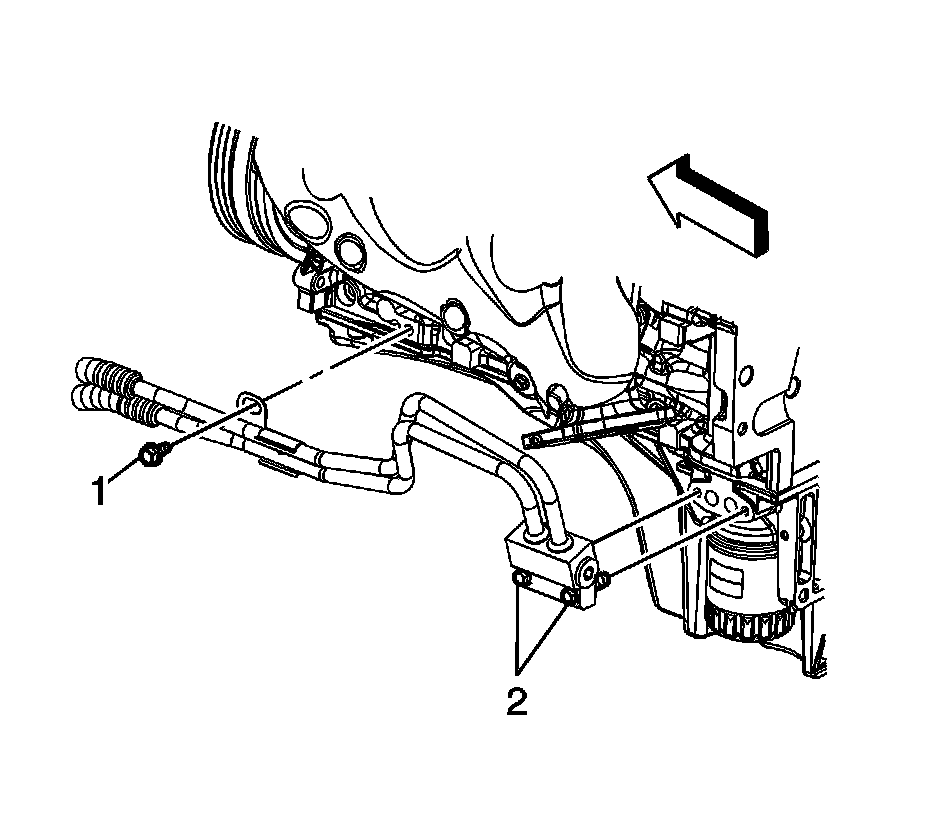 6. Remove the oil cooler hose adapter bolts (2), if equipped.