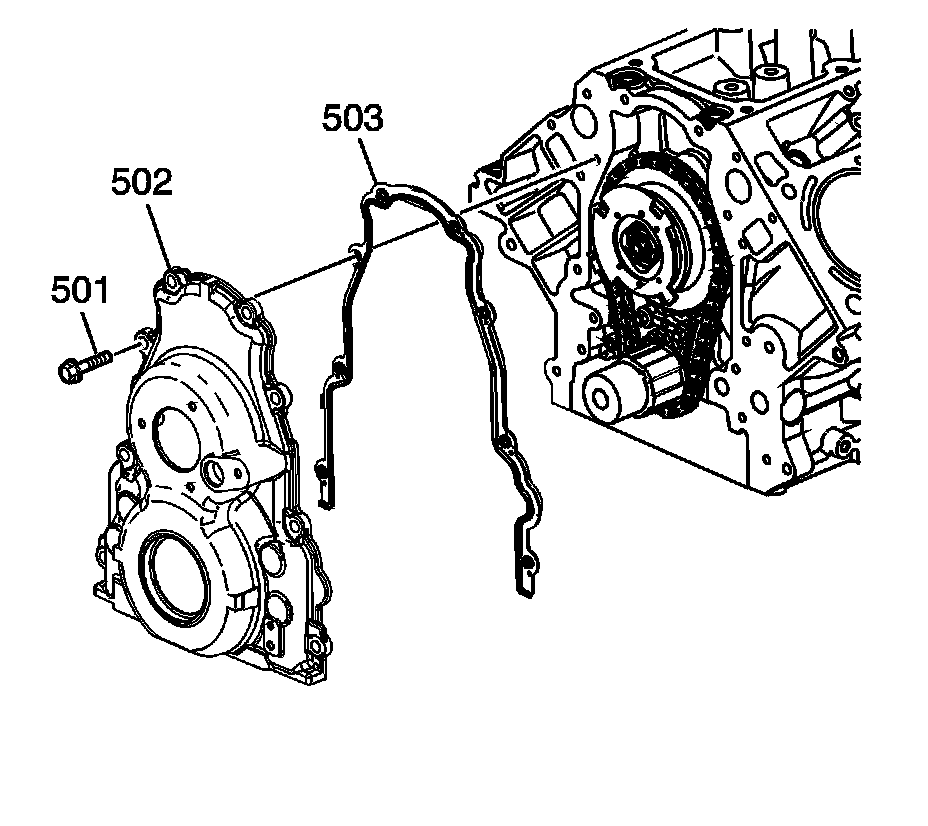 Install the front cover gasket (503), front cover (502), and bolts (501).