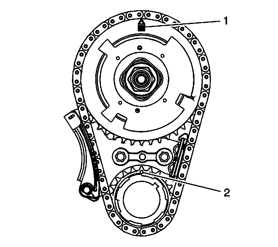 In this position, cylinder number 1 rocker arms will be off lobe lift, and the crankshaft sprocket key will be at the 1:30 position. The camshaft and crankshaft sprocket alignment marks (1, 2) will be in the 12 o'clock position. If viewing from the rear of the engine, the additional crankshaft pilot hole, non-threaded, will be in the 10:30 position.