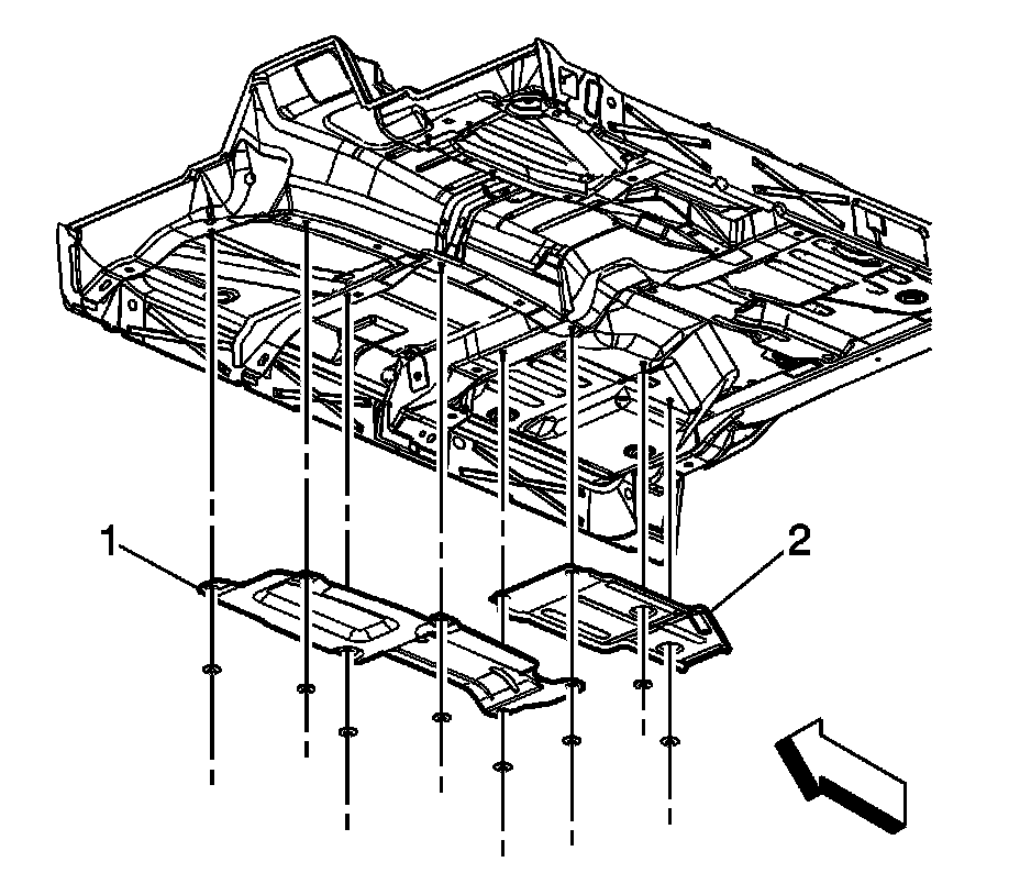 1. If vehicle has a crew cab, position and install the rear exhaust heat shield (2) and/or the front exhaust heat shield (1) to the underbody studs.
