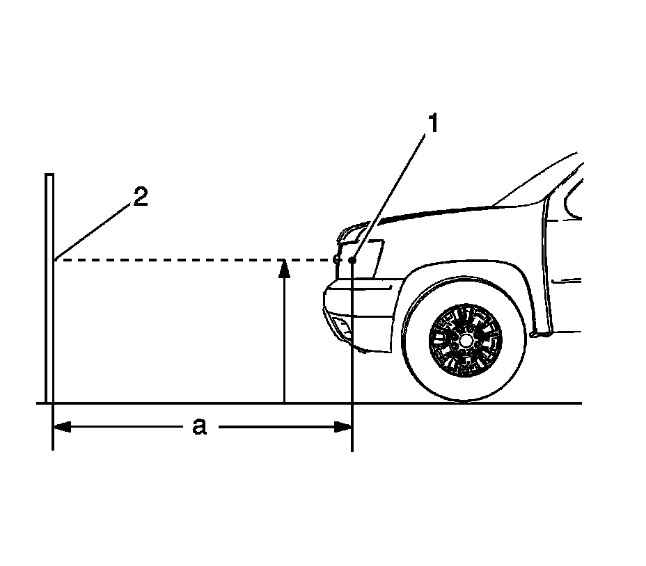 9. Measure from the reference line on the floor to the left headlamp bulb centerline (1).