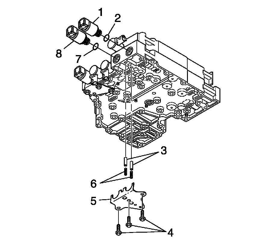 1. Obtain the new solenoid (1) or (8). Lubricate new O-ring (2) or (7) with clean transmission fluid. Install the O-ring and push the new solenoid into the control valve body bore with the wiring harness connector in the correct position.