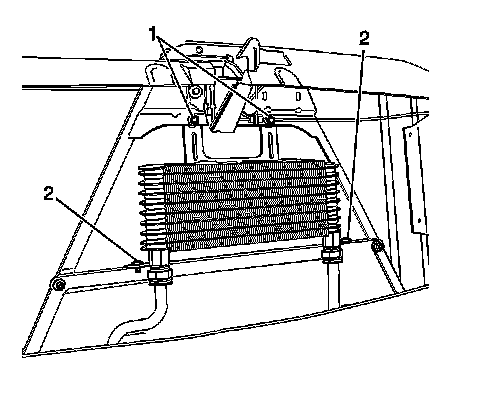 2. Install the bolts (1) and the push pins (2) that retain the auxiliary oil cooler to the radiator brace.