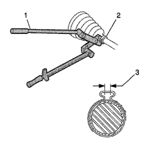 3. Using the J 35910 , a breaker bar, and a torque wrench (1), close the boot clamp (2) until the gap (3) measures 2.15 mm (0.085 inch).