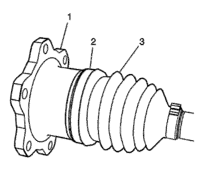 7. Place approximately half of the lubricant (2) in the boot (1) and the remaining half in the tripot housing (3).