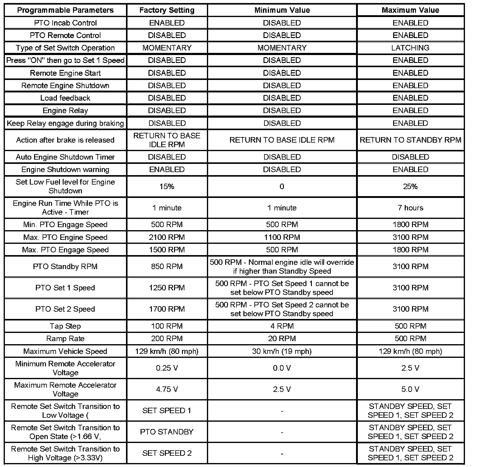 * Engine shutdown based on critical engine conditions: The engine can be shutdown when PTO is operating if a critical engine condition is detected by the vehicle system (i.e., low oil, low oil pressure, hot engine, hot transmission, low fuel).