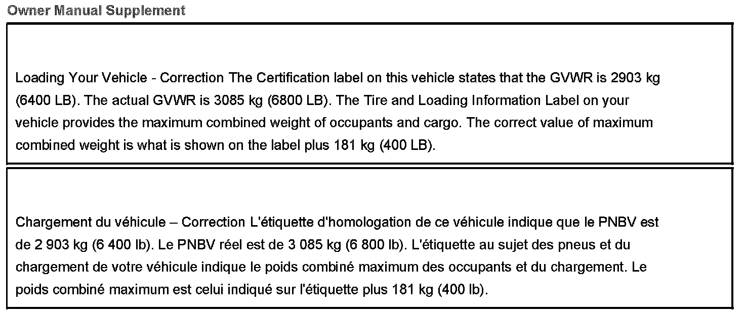 Certain 2007 model year 1500 Series, 4WD, regular cab, long box Chevrolet Silverado and GMC Sierra vehicles have an incorrect GVWR on the Certification Label, and an incorrect capacity shown on the Tire and Loading Information Label. Both of these numbers should be increased by 181 kg (400 lb). An owner manual supplement is to be placed in the IP storage compartment of involved vehicles. A copy is shown above.