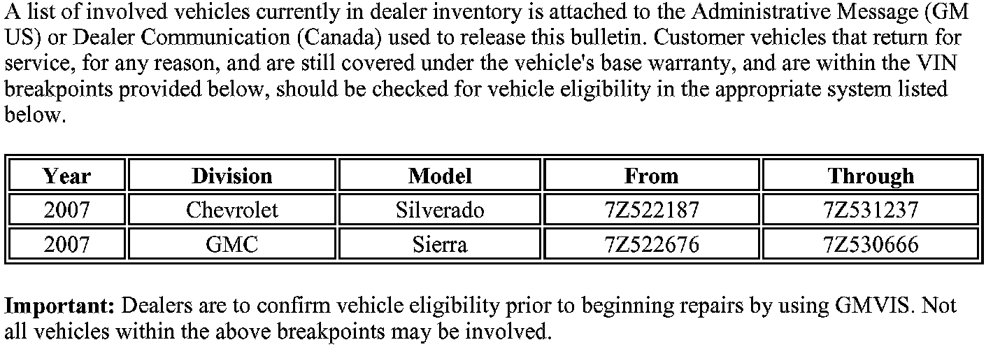 This service procedure should he completed as soon as possible on involved vehicles currently in dealer inventory and customer vehicles that return to the dealer for any type of service during the New Vehicle Limited Warranty coverage period.