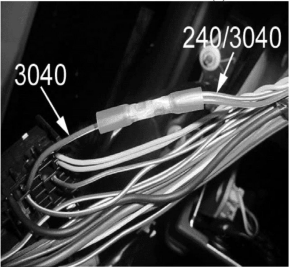9. Locate circuit 3040 (red wire with a white stripe) (2) located in cavity D1 of connector X1 and cut the 240 and 3040 wires 75 mm (3 in) from the back of the connector. Strip the ends of the wires.