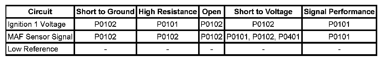 * A slight to moderate resistance of 10-20 ohms on the MAF sensor ignition 1 voltage circuit may cause this DTC to set.