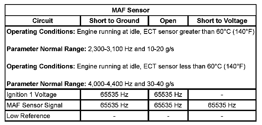 The ECM applies 5 volts to the MAF sensor on the MAF sensor signal circuit. The sensor uses the voltage to produce a frequency based on the inlet airflow through the sensor bore. The frequency varies in a range depending on engine coolant temperature (ECT) of approximately 2,300 Hertz at idle to near 9,000 Hertz at maximum engine load.