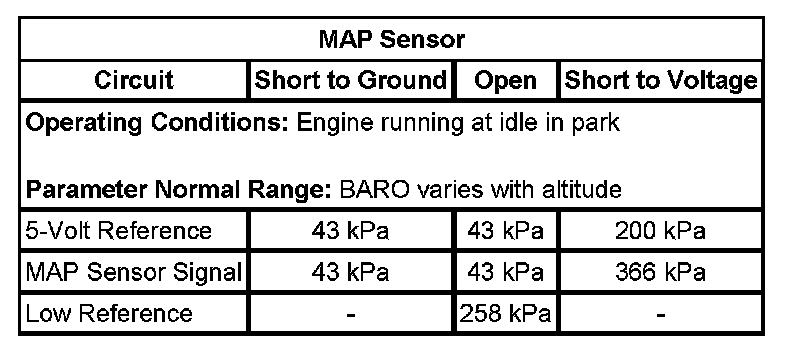 1. Engine running, observe the scan tool MAP and BARO parameters. The MAP and BARO sensor parameters should be within 5 kPa of each other.