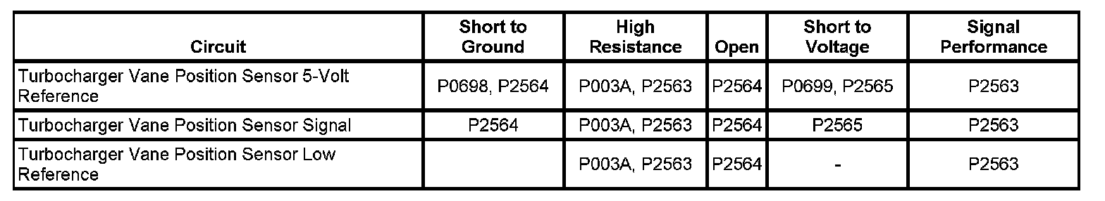 The ECM detects that the difference between turbocharger actual vane position and the desired vane position is 15 percent less than or greater than a calibrated value for greater than 5 seconds.