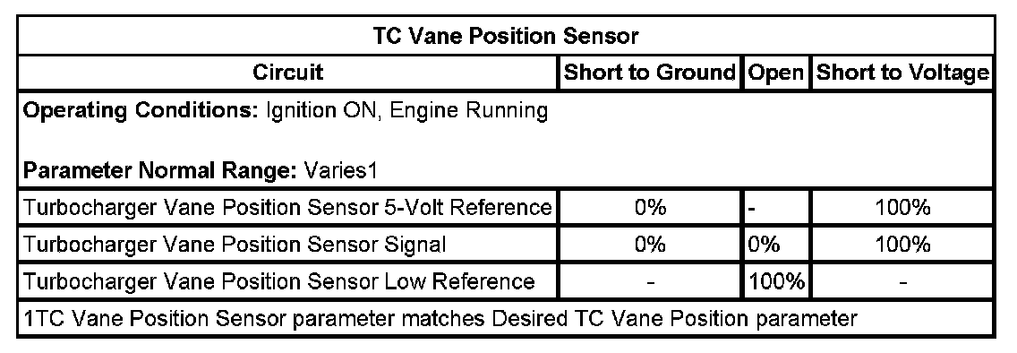 9.. Command the turbocharger TC vane position sensor from 0 percent to 100 percent while observing the TC Vane Position Sensor Volts parameter. The voltage should increment smoothly and gradually from approximately 1.0 volt to greater than 3.5 volt at 100 percent.