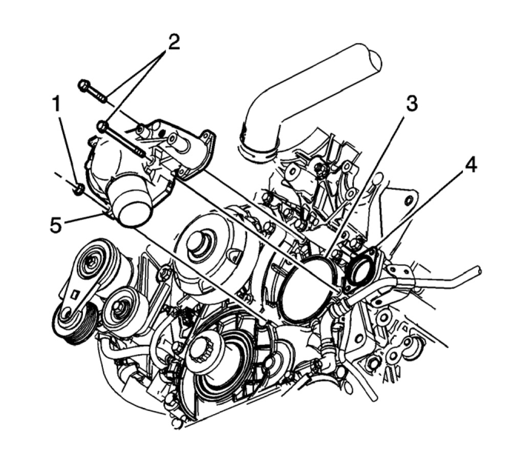 9. Remove and discard the water pump O-ring (3) and the coolant pump outlet pipe gasket (4).