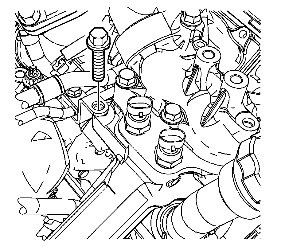 6. Install the fuel line bracket bolt at the thermostat housing crossover.