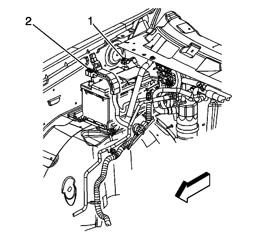 24. Reposition the starter solenoid cable terminal (2) from the engine wiring harness ground terminal (1).