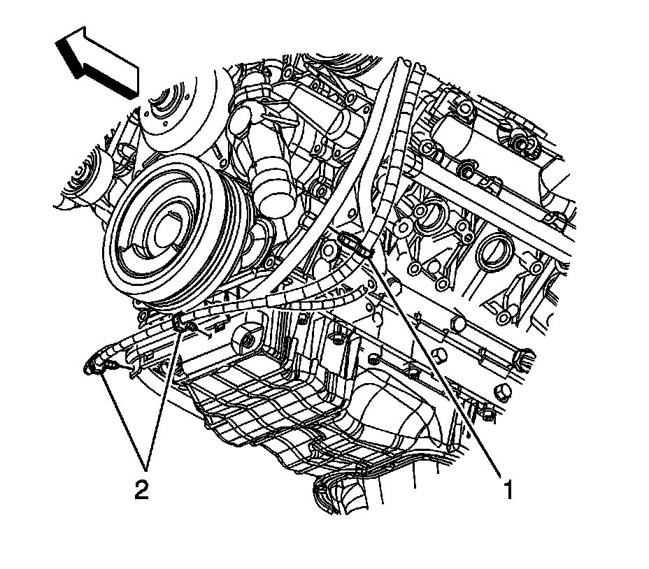 9. Position the starter solenoid cable to the oil pan and install the starter solenoid cable channel bolts (1).