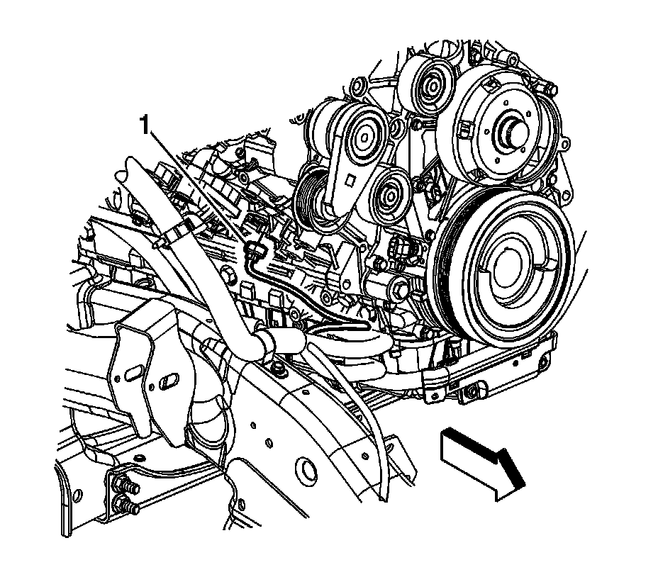 16. Remove the engine wiring harness clip (1) from the starter solenoid cable.