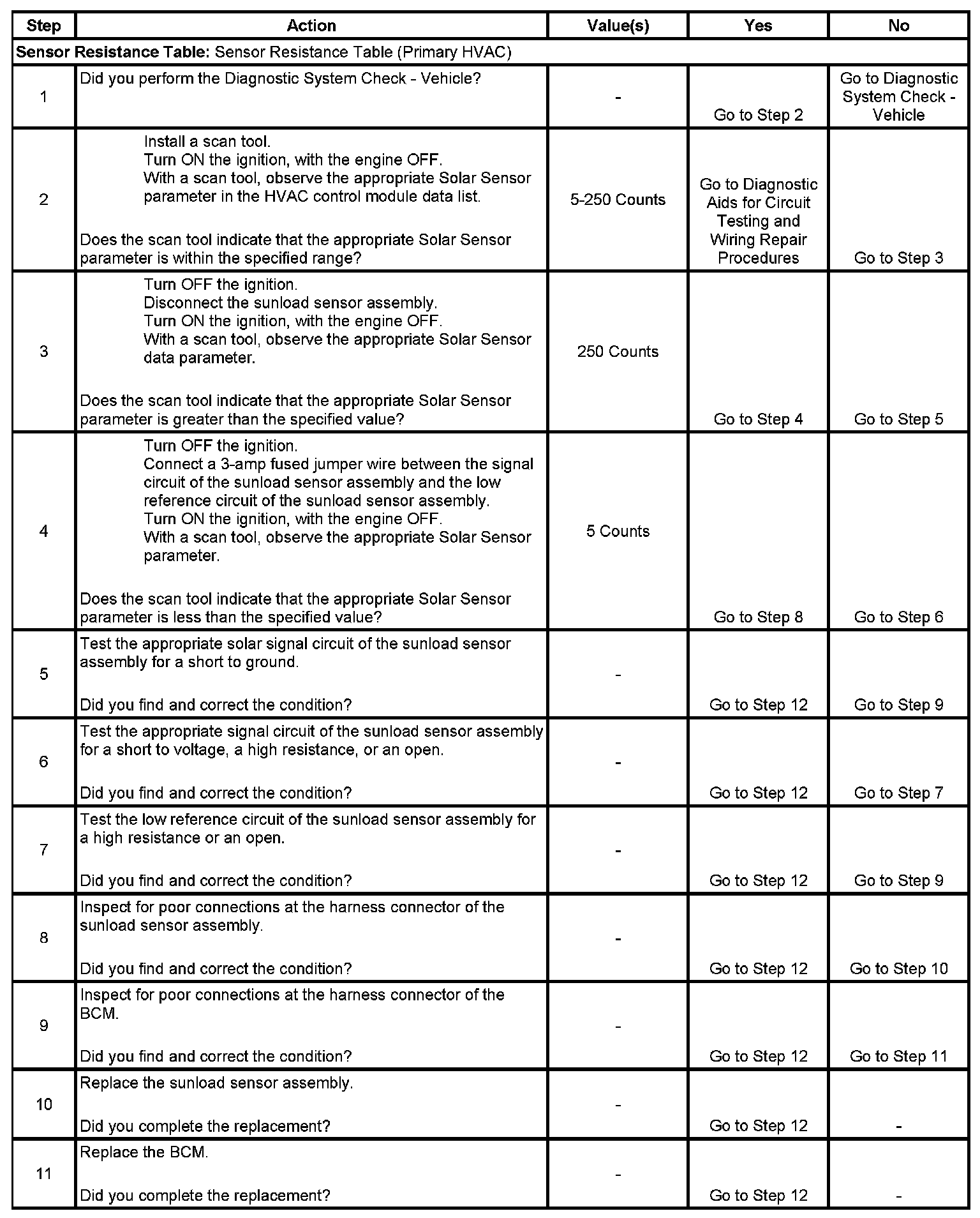 The BCM determines that the value of the sunload sensor signal is less than 5 counts or greater than 250 counts.