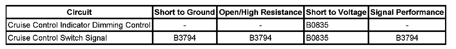 * The BCM detects excessive current in the cruise control indicator dimming control or the cruise control switch signal circuit.