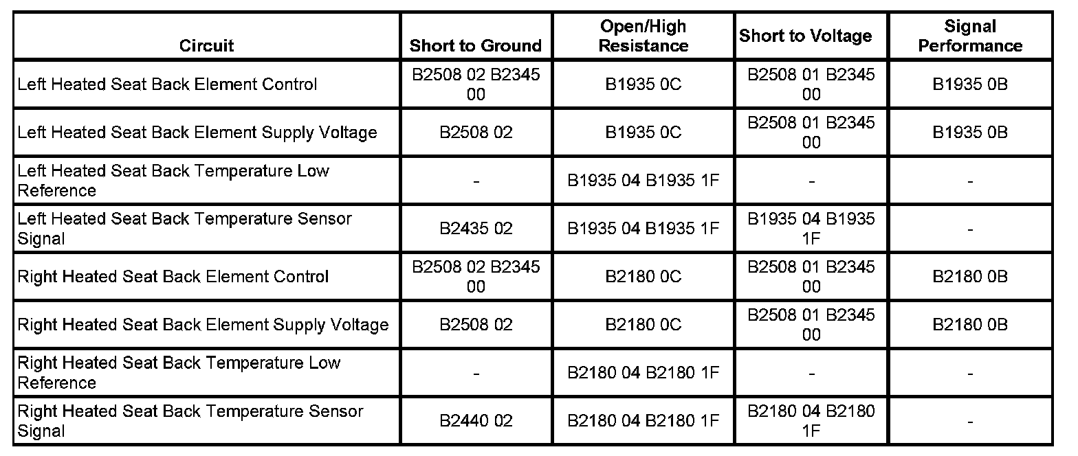 - Left Seat Back Heater Sensor Circuit Shorted to Ground