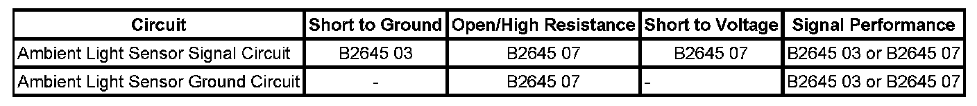 The DTC will set when the BCM detects voltage is above 4.9 volts in the ambient light sensor signal circuit or if the ambient light sensor ground circuit is open.