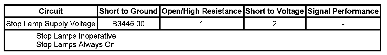 The BCM detects a short to ground in the stop lamp supply voltage circuit when the stop lamps are commanded ON.