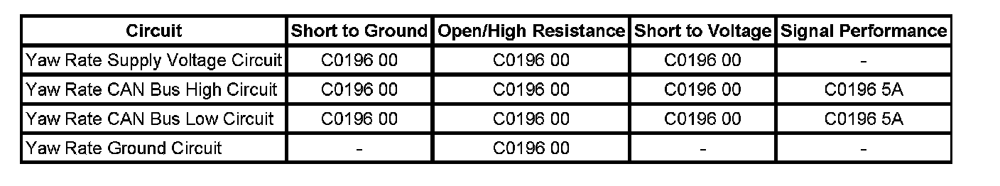 2. Test the yaw rate/lateral sensor reference voltage circuit for a short to voltage, short to ground, an open or high resistance.