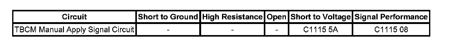 When the manual trailer brake apply switch is shorted to ground, shorted to battery, or open circuit, DTC C1116 Manual Apply Switch Primary input circuit fault may also be set as a current DTC. If DTC C1116 is also set as current DTC, then diagnose DTC C1116 first before to diagnosing DTC C1115 08 and C1115 5A.