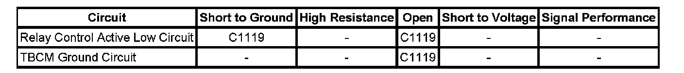 Diagnose an open circuit in trailer brake control module ground circuit or trailer brake control relay ground circuit will also cause DTC C1119 being set as current DTC. When DTC C1119 is set as current DTC, trailer brake control module ground circuit or trailer brake control relay ground circuit should be diagnose for open circuit, before to diagnosing the trailer brake control relay current feedback circuit.