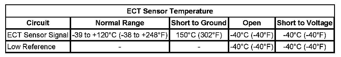 The ECM detects that the ECT is less than -39°C (-38°F) for more than 5 seconds.