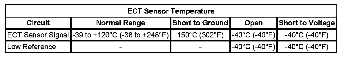 The engine coolant temperature (ECT) sensor is a variable resistor that measures the temperature of the engine coolant. The engine control module (ECM) supplies 5 volts to the ECT sensor signal circuit and supplies a ground to the low reference circuit.