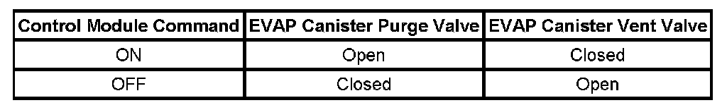 The control module tests the Evaporative Emission (EVAP) System for a large leak or restrictions to the purge path in the EVAP system. When the enabling criteria has been met the control module commands the EVAP vent solenoid valve ON and the EVAP purge solenoid valve ON, allowing vacuum into the EVAP system. The control module monitors the fuel tank pressure (FTP) sensor voltage to verify that the system is able to reach a predetermined level of vacuum within a set amount of time. The following table illustrates the relationship between the ON and OFF states, and the Open or Closed states of the EVAP canister purge and vent valves.